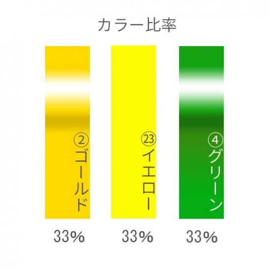 メタリックゴールドとプラカラーイエローを基本に、メタリックグリーン(緑)を入れた3色のチアポンポンです。同系色の金と黄の中に、差し色の緑を入れることによって、鮮やかな印象のポンポンに仕上がりました。