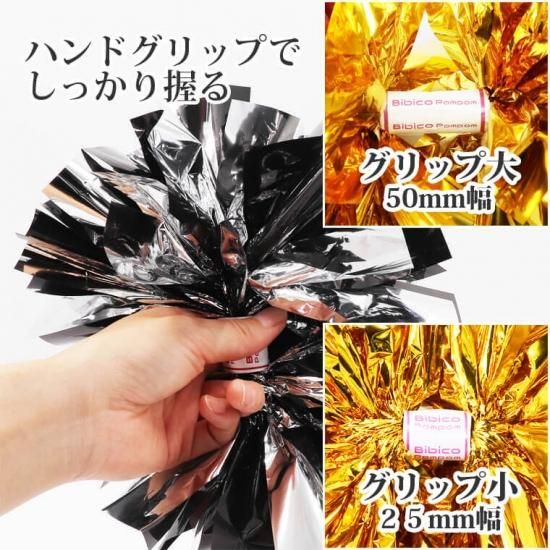 20mmテープは密度が高く、ポンポンを振ると動きが出る。50mmテープは立体感が出る。そんな良い部分を両立しているのが、35mm幅テープを使用した当店のチアポンポンです。