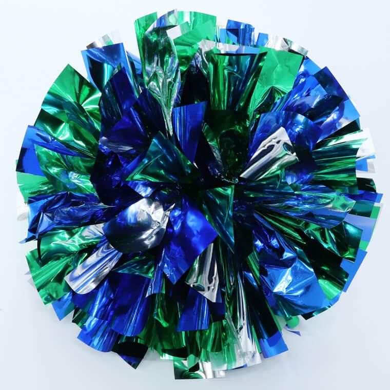 定番のシルバーに、グリーン、ブルーを使用した3色ミックスポンポンです。同系色の2色のメタリックカラーの微妙な変化で、鮮やかなチアポンポンに仕上がりました。